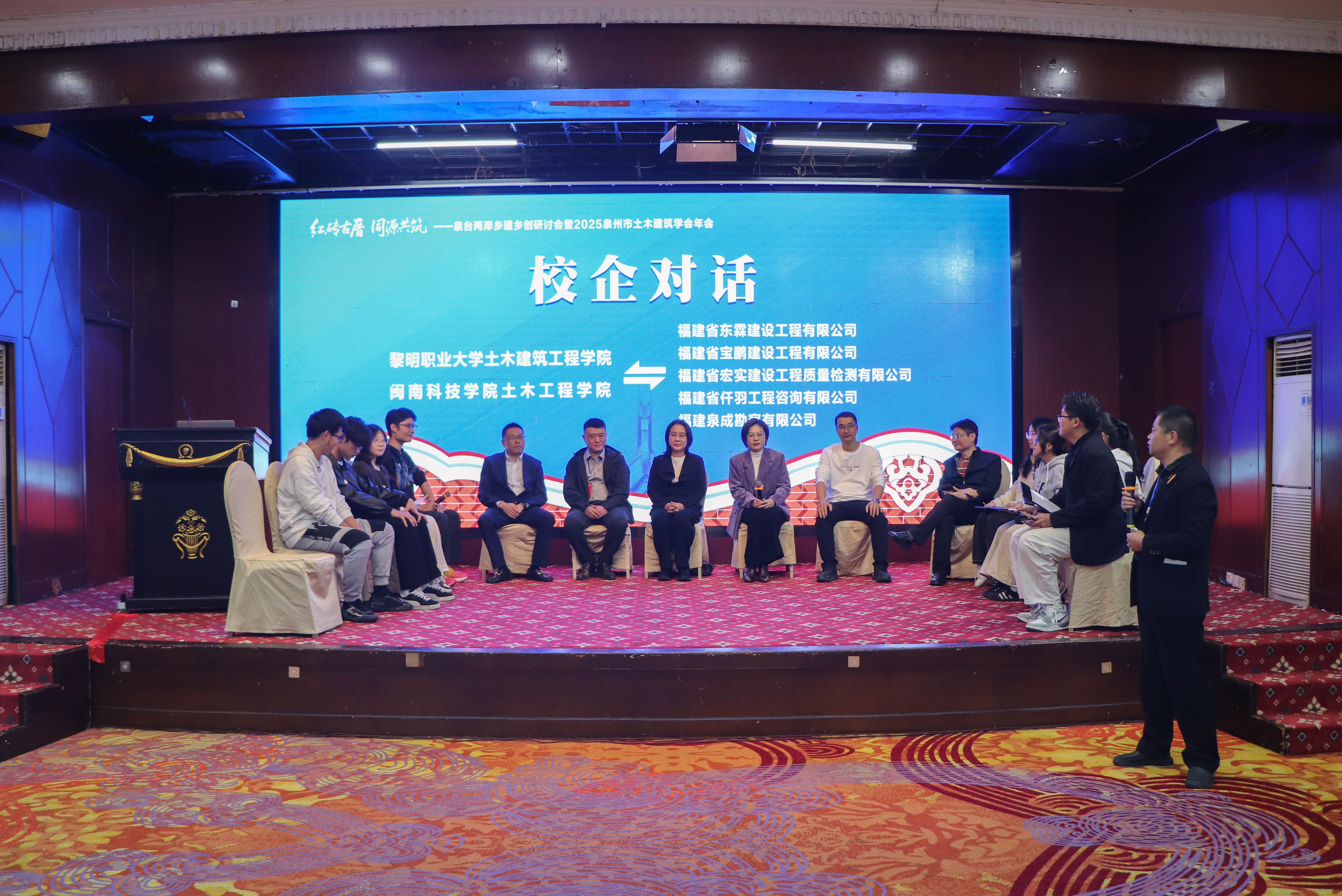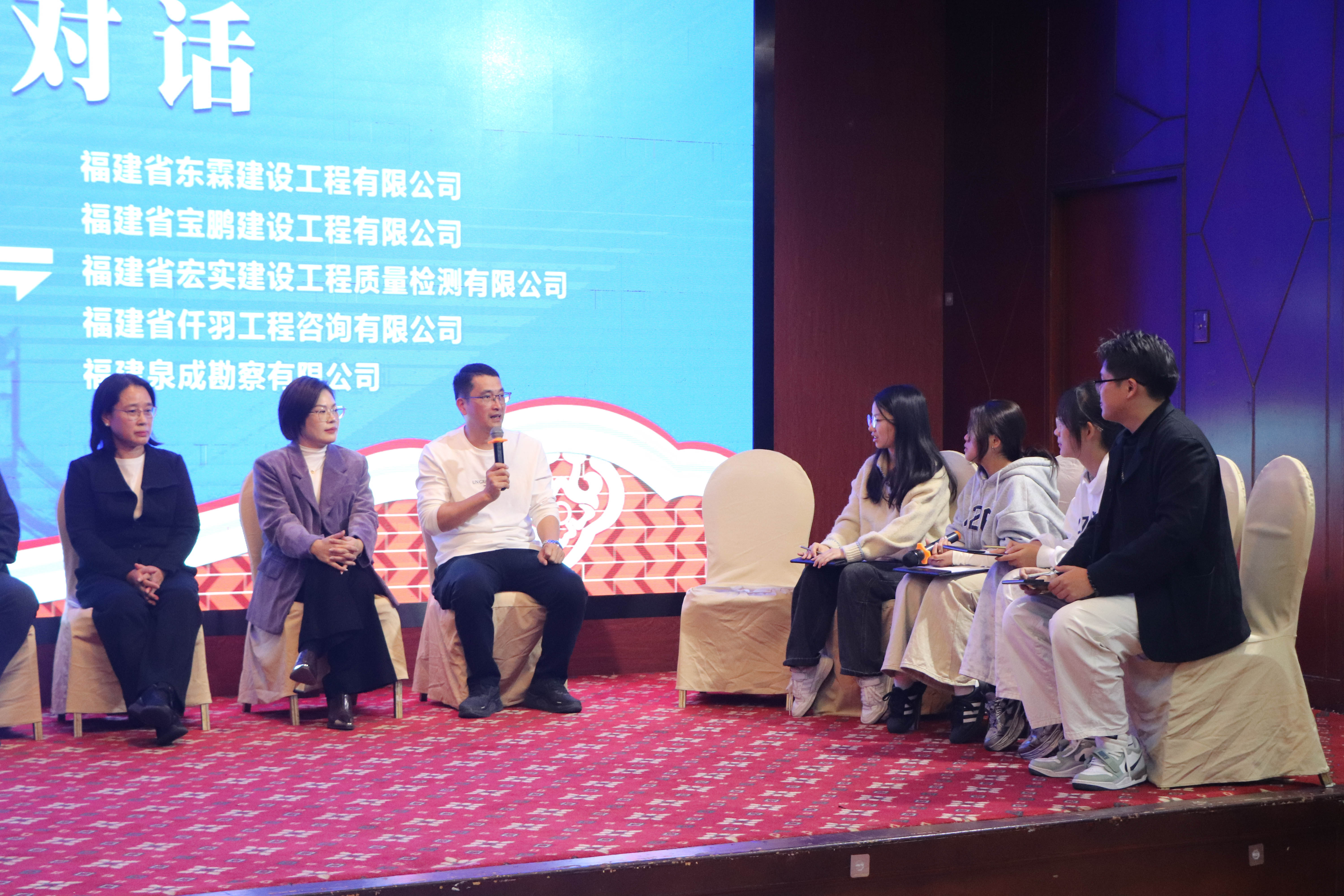 近日,在“红砖古厝,同源共筑”泉台两岸乡建乡创研讨会暨2025泉州市土木建筑学会年会期间,一场聚焦行业未来与人才发展的校企对话成功举行。本次活动由泉州市土木建筑学会副会长、闽南科技学院土木工程学院副院长贾玉祥主持,汇聚了黎明职业大学土木建筑工程学院、闽南科技学院土木工程学院的师生代表,以及福建省东霖建设工程有限公司总经理陈贤玻、福建省宝鹏建设工程有限公司黄明科、福建省宏实建设工程质量检测有限公司人力总监罗玲、福建省仟羽工程咨询有限公司总经理黄文红、福建泉成勘察有限公司林志军等多位企业专家,黎明职业大学丁瑜鸿教授亦作为嘉宾出席。双方围绕建筑行业发展趋势、企业人才需求以及学生职业规划等核心议题展开了深入交流。